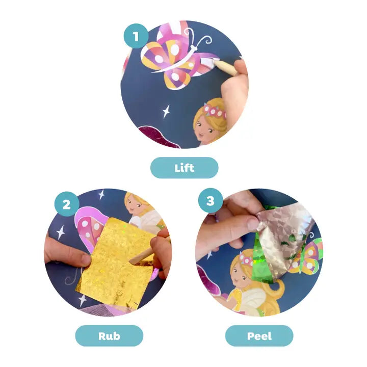 Nnarwhals, mermaids and seahorses are all waiting to be brought alive with a sparkling rub of holographic foil! Simply select an illustrated fairy Art card and use the enclosed lifter to peel sections off the picture, revealing adhesive sections. Grab a foil sheet, rub the foil onto the sticky area and voila! A beautiful shiny artwork. Recommended Ages 5-8 years