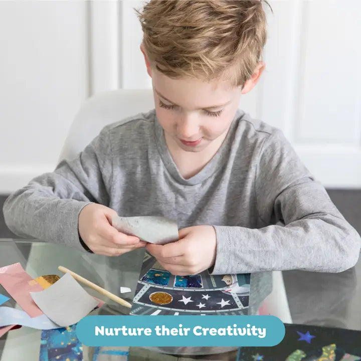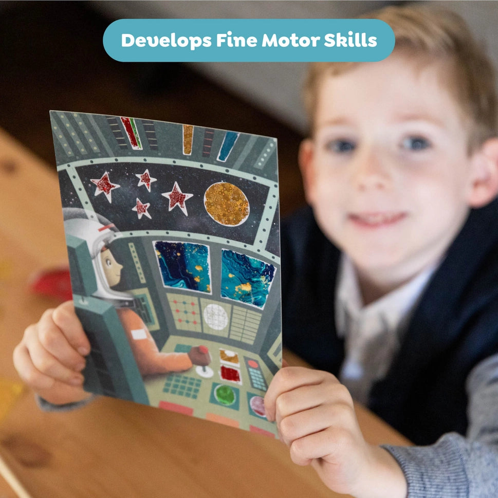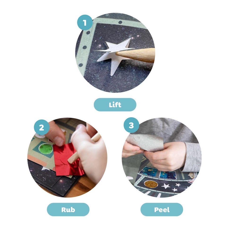 Space suits, rocket ships, planets and stars are all waiting to be brought alive with a sparkling rub of holographic foil! Simply select an illustrated space Art card and use the enclosed wooden lifter to peel sections off the picture, revealing adhesive sections. Grab a foil sheet, rub the foil onto the sticky area and voila! A beautiful shiny artwork. Recommended Ages 5-8 years Available in Foil Art Fairy, Space Adventures and Ocean Magic