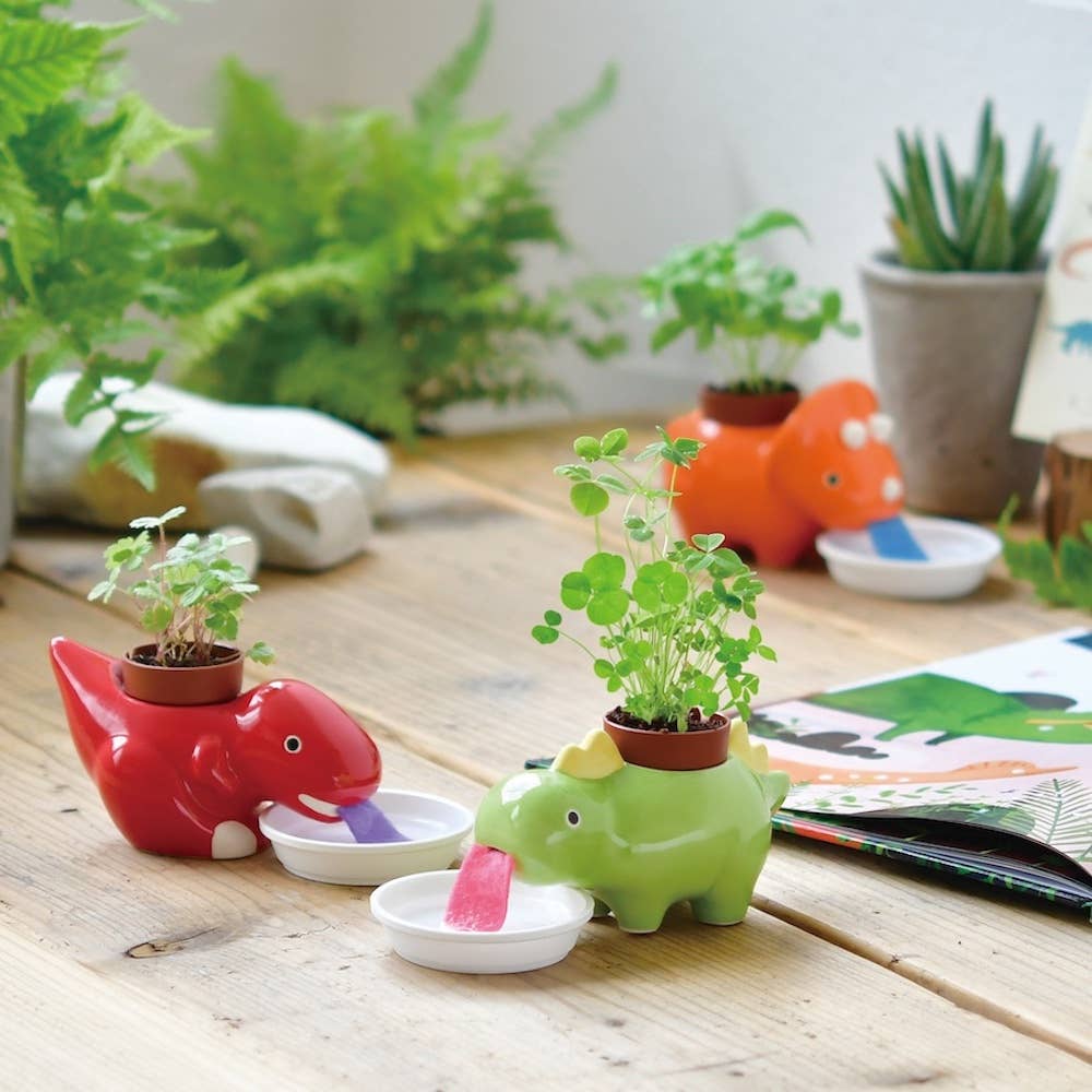 Fiercely cute Green Zaurus lap up water feeding the plant on their back due to a clever felt tongue connected to the pot.
