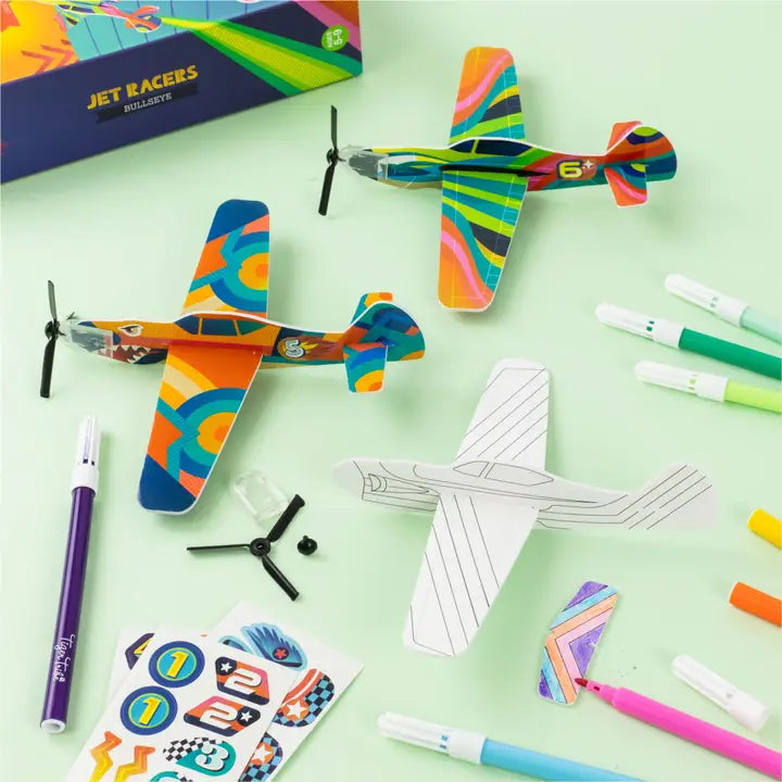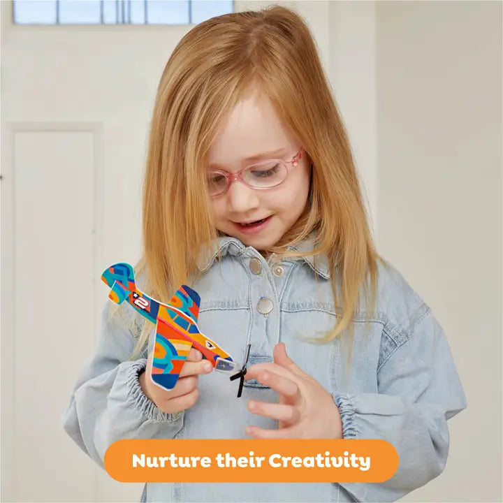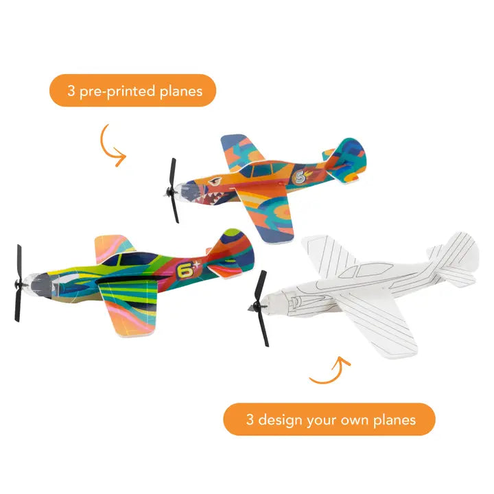 This comprehensive activity set contains pop-out planes primed for decoration with included stickers and vibrant markers. Color and decorate the planes then construct the planes with propellors and aerodynamic protective nose cones to ensure a smooth flight, and the large format target sheets transition the creative activity into a fun game of skill.