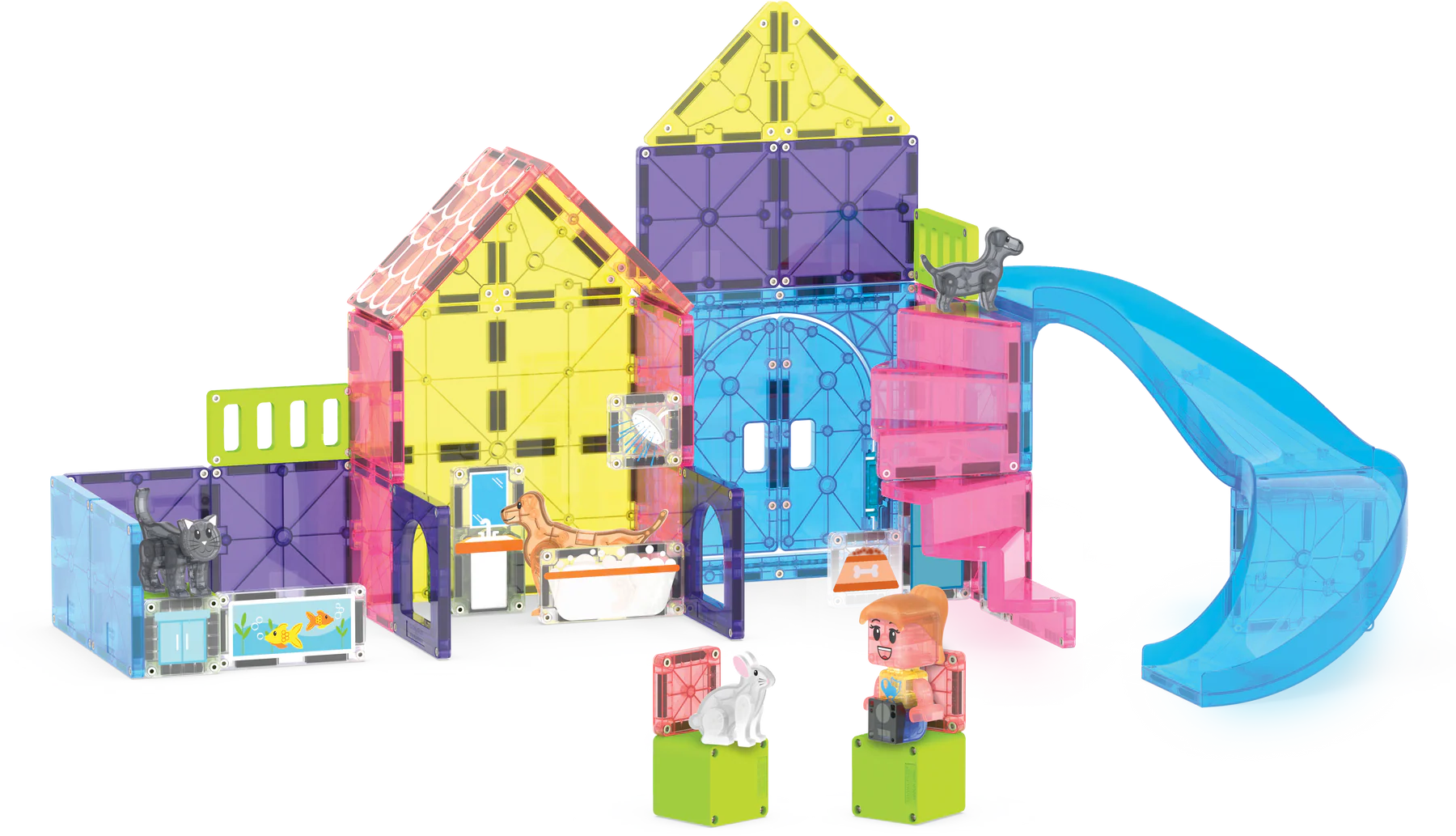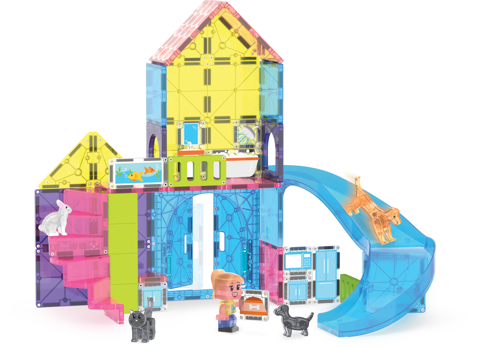 Step into a world where pets are here to play and creativity knows no bounds. With the MAGNA-TILES Pet Playhouse, kids can build the ultimate pet paradise for a playful puppy, a curious cat, a bouncy bunny, and their adventurous dog friend. Open the Double Door to a playhouse where your pets climb furniture, glide down the new Slide piece, and explore a space filled with endless imaginative possibilities.