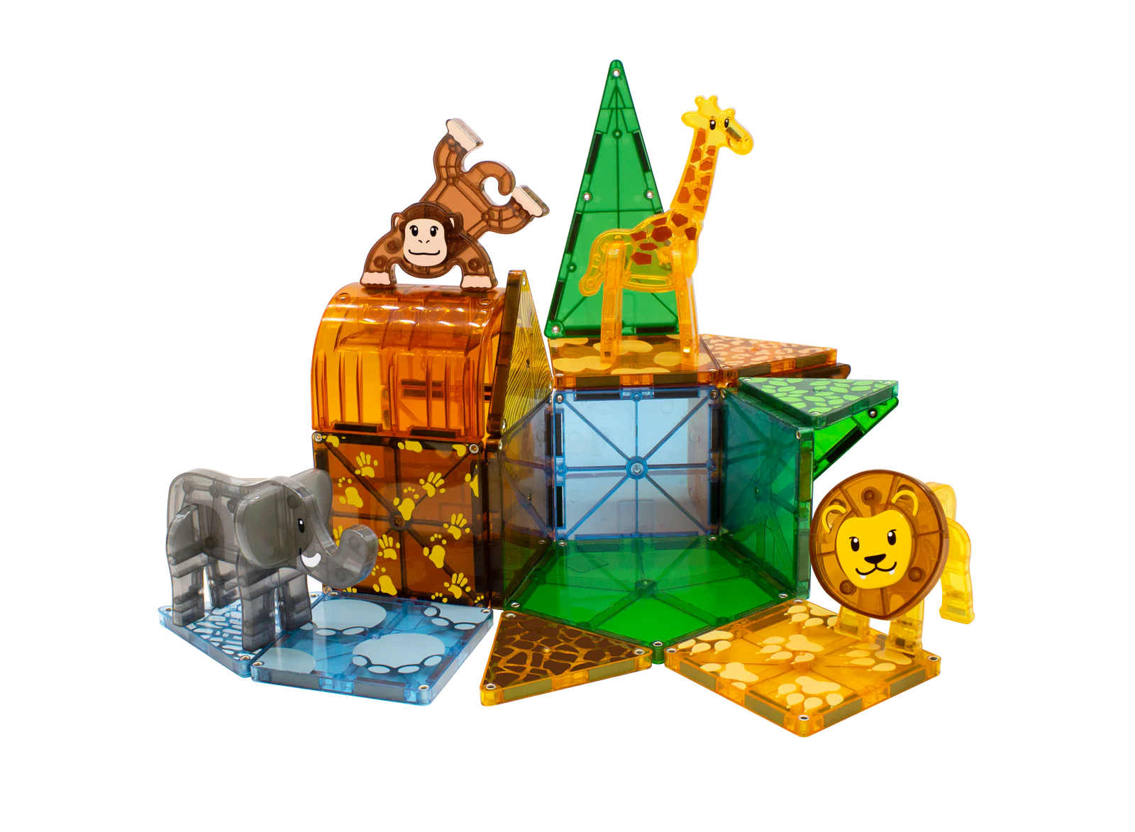 Anything can happen in the wild! Start your expedition with the Safari 25-Piece set for a roaring good time. Monkey around with magnetic, savannah-themed tiles as you explore the vibrant-colored habitat with your four safari sidekicks. Jump into imaginative play and screen-free fun while going on an absolu-tile-y wild adventure through canopies, treetops, and hidden alcoves.