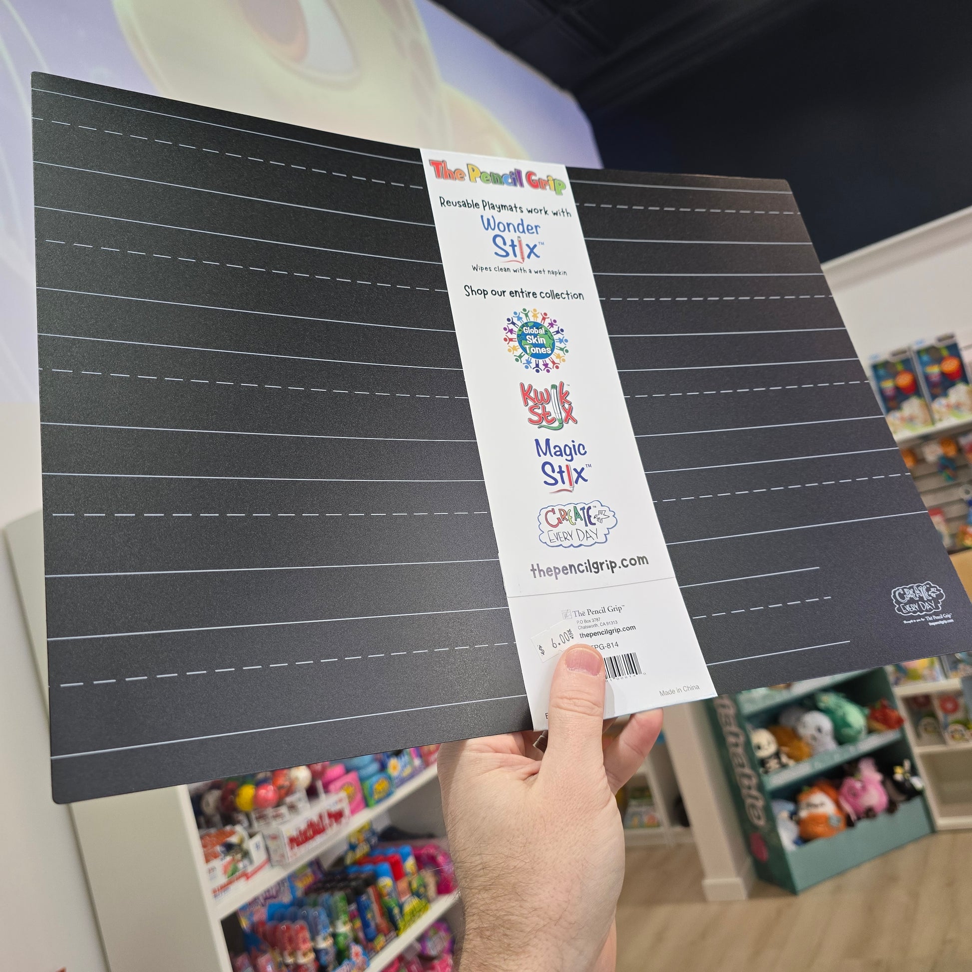 - Playmat is 12"x17", 2-sided (back has practice lines)